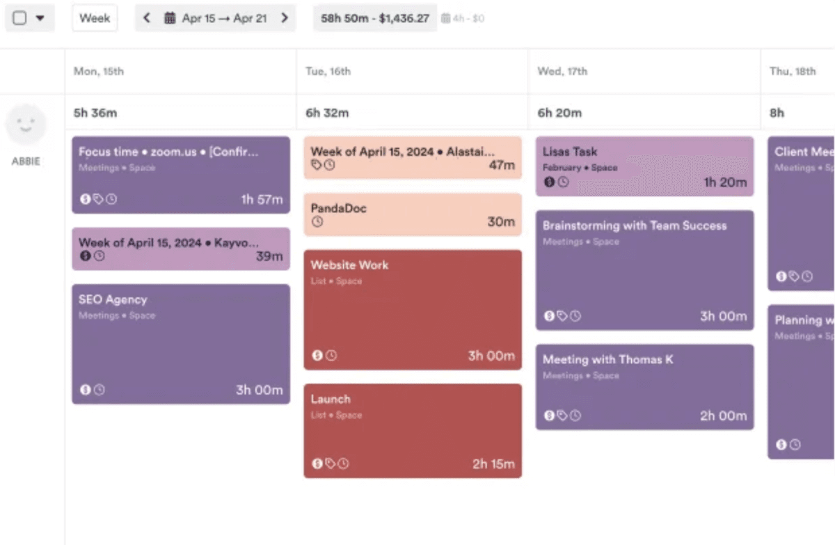 - Client overspend check: filter to last week, group by client, sort by total hours, then drill into the top two clients and confirm you can get a breakdown of time spent by project and person.