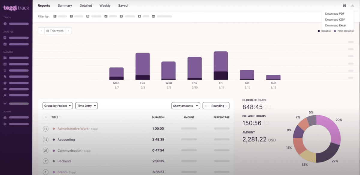You need comprehensive reporting capabilities that match how you review work and build invoices, without rebuilding everything in a spreadsheet. The basics should be easy: billable versus non-billable splits, client and project totals, and detailed time reports with customized reporting for account managers.