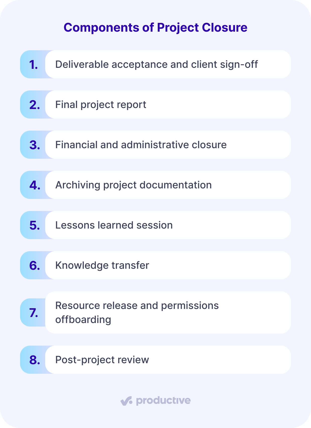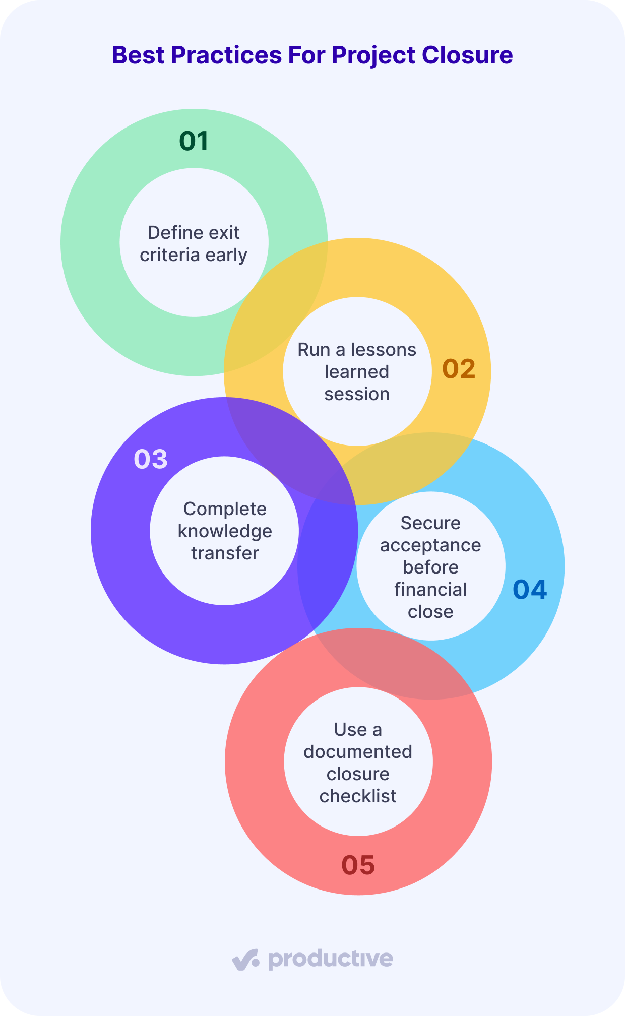 Build a closure checklist that covers every required area: final deliverables, client acceptance, documentation, financials, and offboarding. In Productive or your PM tool, set it as a required step before marking a project closed.