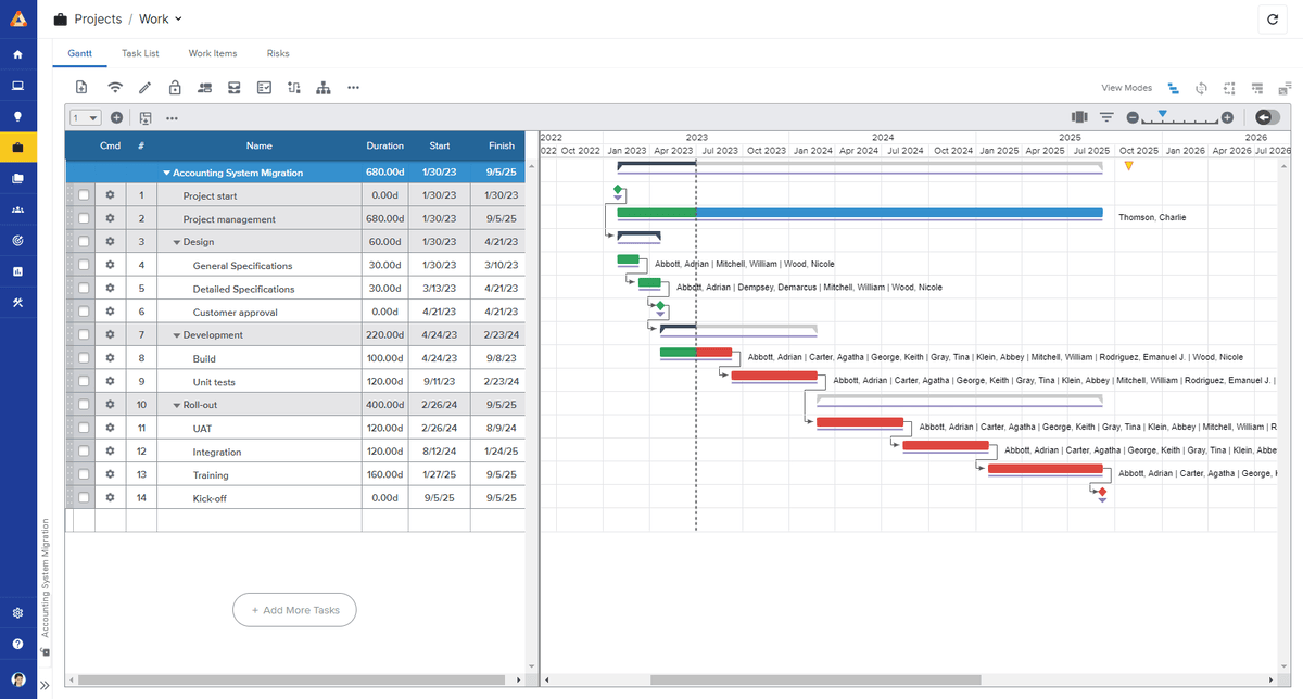 - Interactive Gantt charts with critical path analysis