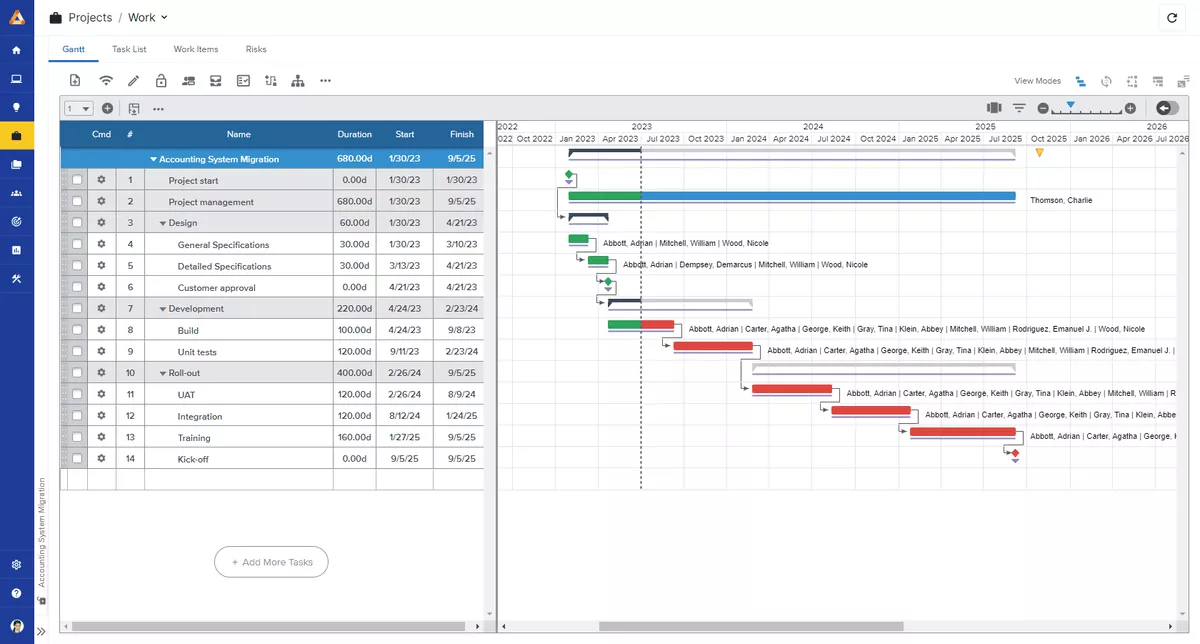 - Interactive Gantt charts with critical path analysis
