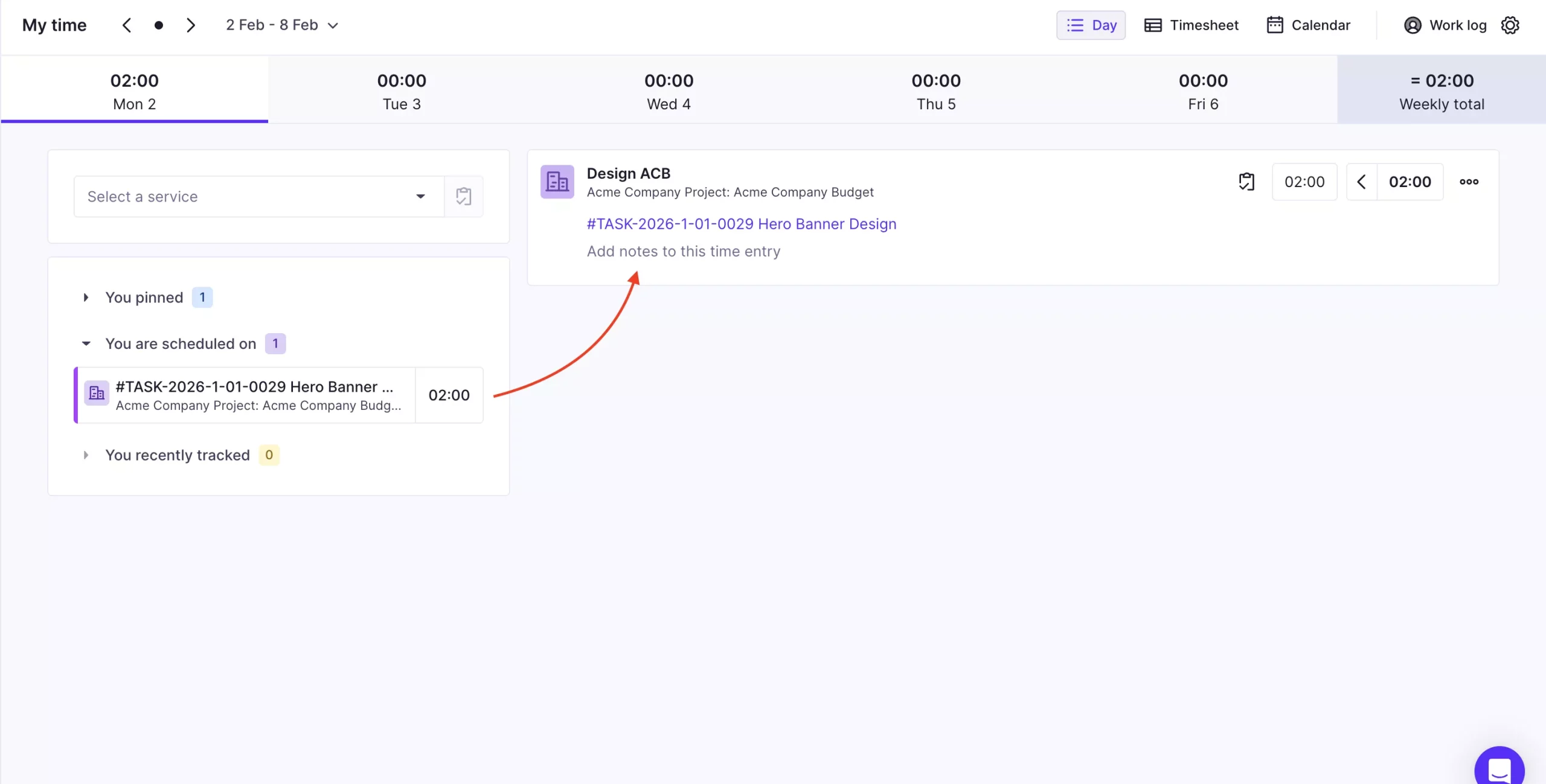 Bookings created on tasks will show up as time tracking suggestions, same as bookings on services. When they’re logged as entries, they’ll be automatically associated with their task.