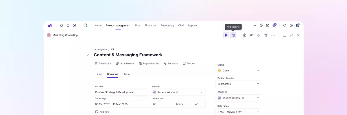 - Personen für Aufgaben einplanen ist endlich da! Du kannst jetzt Buchungen direkt in Aufgaben erstellen und ihre Auswirkungen auf deine Projektfinanzen sehen. Buchungen sind auch mit dem Zeitplan der Aufgabe verknüpft, sodass alle wichtigen Änderungen automatisch synchronisiert werden. Um diese Funktion zu nutzen, gehe zu Einstellungen > Ressourcenplanung und schalte den Schalter ein.