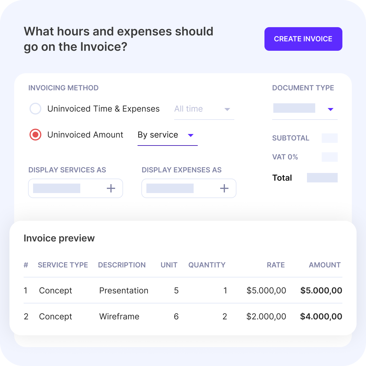 Choose which services or projects you want to bill. Combine various projects and services to invoice multiple budgets at once.