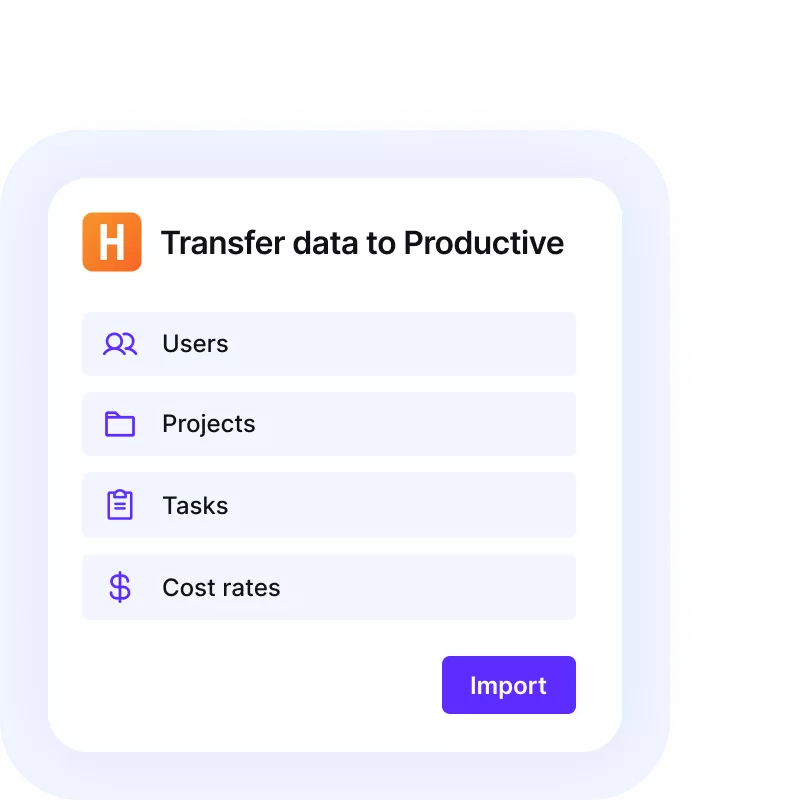 Switch from Harvest without losing your data. Import projects, users, tasks, and recent time entries into Productive in a few clicks.